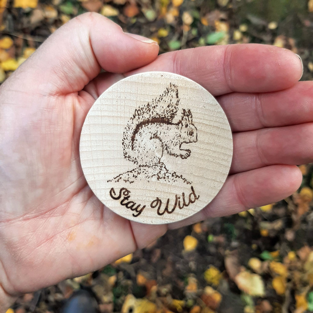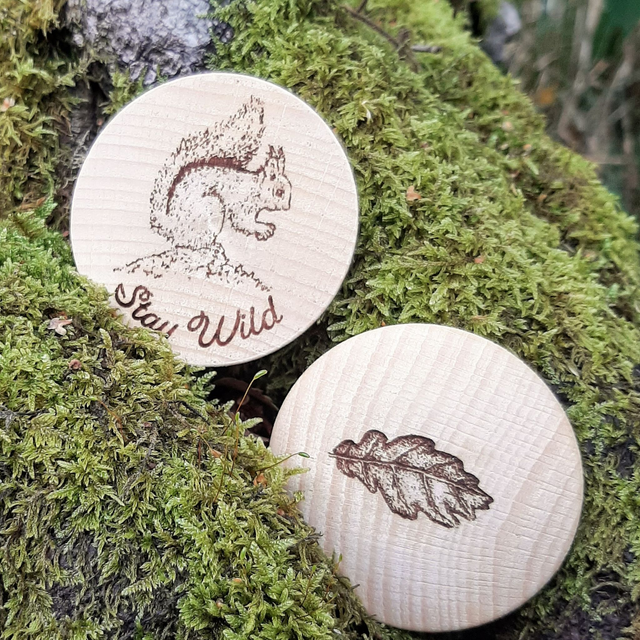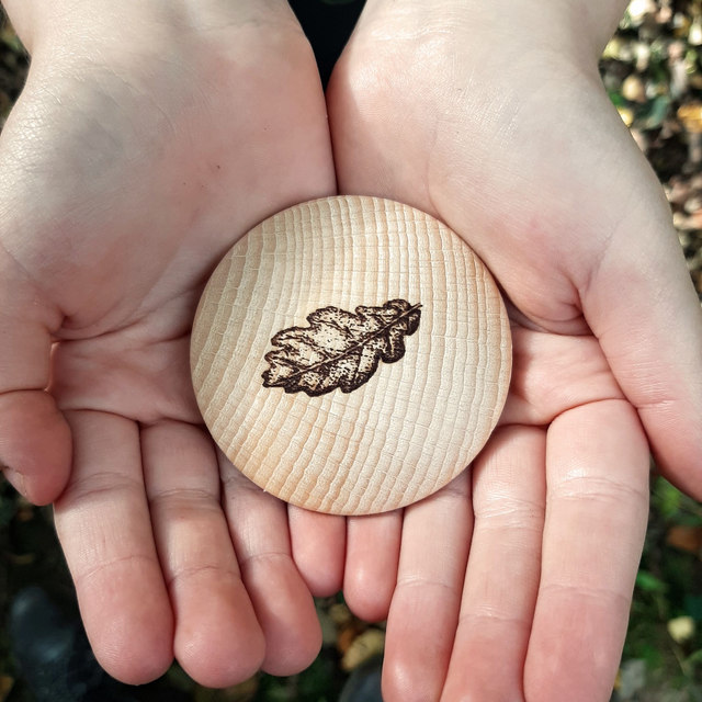 Each Pocket Wild is a natural wooden disc engraved with one of my hand-drawn illustrations. The reverse is domed to sit comfortably in the palm, and engraved with a hand-drawn Oak leaf. Some people may find them useful as a pocket pebble / worry stone for anxiety relief. Or simply a little piece of the wild to carry with them.