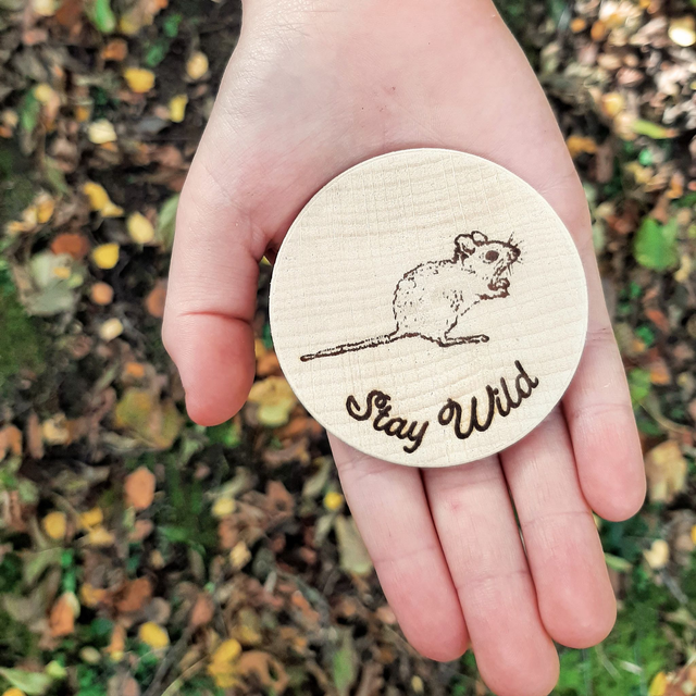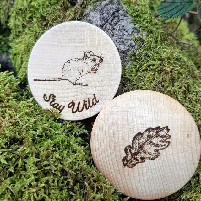 Each Pocket Wild is a natural wooden disc engraved with one of my hand-drawn illustrations. The reverse is domed to sit comfortably in the palm, and engraved with a hand-drawn Oak leaf. Some people may find them useful as a pocket pebble / worry stone for anxiety relief. Or simply a little piece of the wild to carry with them.